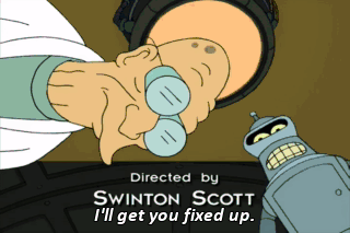 I'll get you fixed up. - Ohhh! - That's fine. Wait a minute! Bender, what did you just do to the professor? I bent him. Bender!