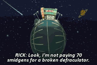 RICK: Look, I'm not paying 70 smidgens for a broken defraculator.
