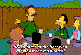 Hey, a toast to the host who can boast the most roast! Thanks, Flanders. I have to agree that everything certainly-- Huh? Bart! No! What? Sorry. Force of habit. Lisa! No!