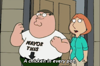 A chicken in every pot, and a cap in every ass! Peter, put that away! Where did you get the metal for all those guns?