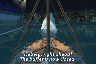 Iceberg, right ahead! The buffet is now closed. Iceberg, right ahead! The buffet is now closed.