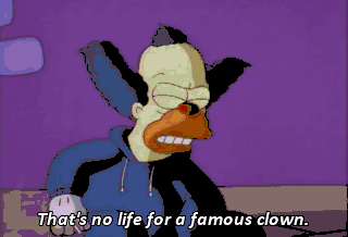 That's no life for a famous clown. Well, if it'll make you feel any better, Krusty, you can punch me in the face. Nah, forget it. Go home, kid. Shiva H. Vishnu!