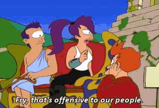Fry, that's offensive to our people. Isn't it? Ow. This is my home. I hope you don't think less of me because I live in a giant castle. Oh, no, not at all. If anything, I'm more impressed.