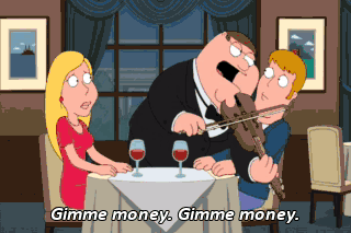 Gimme money. Gimme money. You be careful, sweetie, and call us as soon as the plane lands. Okay, Mom, I will. I'll miss you, Dad. (GROANS) I've never been very good at saying good-bee. Good-bee, Meg.