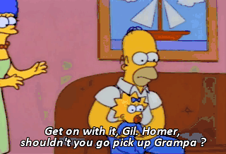 Get on with it, Gil. Homer, shouldn't you go pick up Grampa ? Halftime, Marge. Halftime ! Ding-dong ! Here comes the cavalry.