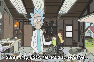 Sure thing, Rick. Here's a screwdriver. All right, Marty, Thank you very much. We got one screw turn... and two screw turns... and... All right, Marty, here we are. Oh, my god, Rick! Is that us?!