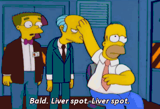 Bald. Liver spot. Liver spot. Hmm. Turn around, Simpson. No! I can't get in trouble if I can't see you! I'm afraid he's got us, sir.