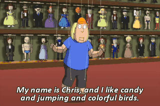 My name is Chris, and I like candy and jumping and colorful birds. Wow! What else do I like? You like the pop singing of today. (POP MUSIC PLAYING) (SINGING IN GERMAN)