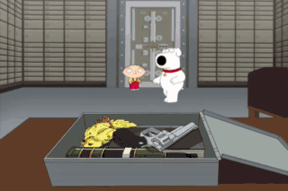 (BOTH GRUNTING) (GUN COCKING) Stewie, come on. You don't know how to use that thing. Oh, really? What if I hold it sideways like a black guy? Come on, man. Take it easy, all right? I don't want any trouble.