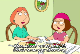 Meg, I need you to baby-sit Stewie tomorrow afternoon. Mom, you know I go to the mall on Saturdays. I mean, I do have a life.