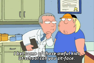 I bet some of those awful kids at school call you zit-face. - No. - Pop-a-zit. - No. - Puspeak. - No. - Fat ass? - Yeah. - That's terrible.