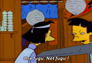 One fugu. Not fugu ! If it is cut improperly, it's, it's-- Yes, yes, it is poisonous, potentially fatal. But if sliced properly, it can be quite tasty. I must get master.