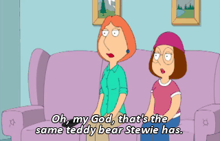 Oh, my God, that's the same teddy bear Stewie has. We got to send that thing back right away.