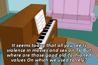 It seems today that all you see Is violence in movies and sex on TV But where are those good old-fashioned values On which we used to rely?
