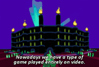 Nowadays we have a type of game played entirely on video. We call it a video game. A video game, you say? Well, golly gee. You mighty spacemen of the future will have to show me how it works.