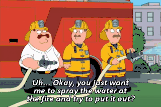 Uh... Okay, you just want me to spray the water at the fire and try to put it out? He knows everything about what we do. Of course he does. Look at that giant horse vagina.
