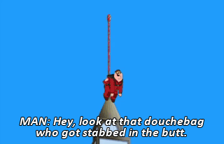 MAN: Hey, look at that douchebag who got stabbed in the butt.