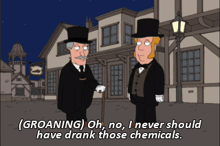 (GROANING) Oh, no, I never should have drank those chemicals. (LAUGHING) Hello.