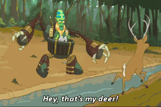 Hey, that's my deer! Aaaaaaah! Raah! I hope your god is as big a dick as you. My god's the biggest dick that's never existed. Why do you think I'm even here?