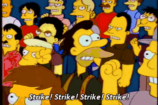Strike! Strike! Strike! Strike! All in favor of a strike? Aye! All opposed? Nay. Who keeps saying that? It was him. Let's get him, fellas.