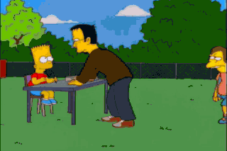 Hey, Soul Patch, you cut the line! Ooh! Here's my card. Whoa! This is people working? This is great. Hey, Bart. Care for a children's cappuccino?