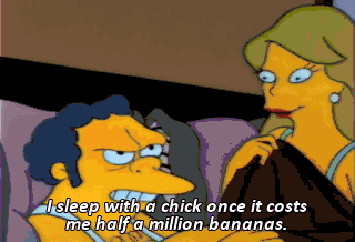 I sleep with a chick once it costs me half a million bananas. Moe, Moe, Moe... Bart, are you going to mow the lawn today? Okay, but you promised me Moe money. I Moe, I Moe. Moe, Moe, Moe...
