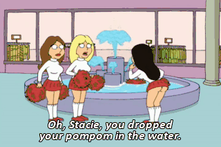 Oh, Stacie, you dropped your pompom in the water. - I'II get it for you. - I'II come with you. - Me, too. - But wait a minute. We don't want to get our sweaters all wet. Better take them off. Splash fight!