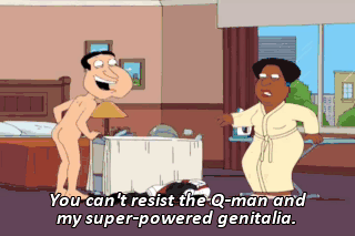 You can't resist the Q-man and my super-powered genitalia. Apache Penis, ee-nay-chok! (GRUNTS) You go on and beat it, little neck! I'm a changed woman! I don't mess with your kind anymore! You're a meanie!