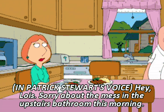 (IN PATRICK STEWART'S VOICE) Hey, Lois. Sorry about the mess in the upstairs bathroom this morning.
