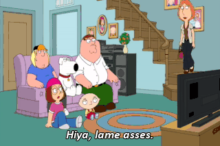 Hiya, lame asses. (ALL EXCLAIMING DISAPPROVAL)