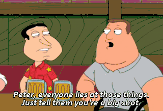Peter, everyone lies at those things. Just tell them you're a big shot. Wait a second, Joe, that's a great idea. Boy, imagine what it would be like to be a big shot. Diego? Sweaty. (MOANS) Thank you.
