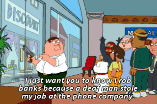 I just want you to know I rob banks because a deaf man stole my job at the phone company.