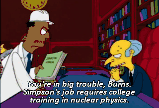 You're in big trouble, Burns. Simpson's job requires college training in nuclear physics.