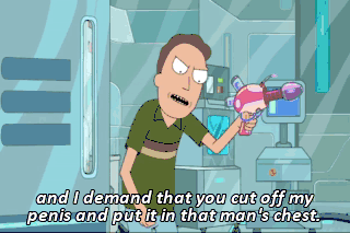 and I demand that you cut off my penis and put it in that man's chest. That's not how it works! Well, you're gonna make it work.