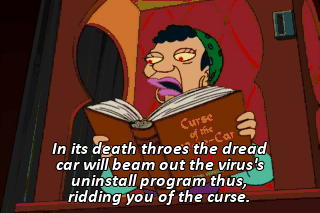 In its death throes the dread car will beam out the virus's uninstall program thus, ridding you of the curse.