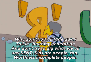 Why don't you all fade away Talkin' 'bout my generation And don't try to dig what we all say KENT: Kids are people, too. Worthless incomplete people.