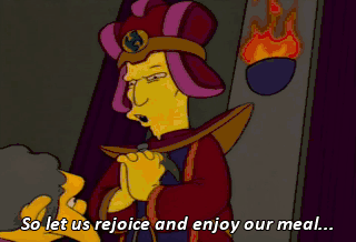 So let us rejoice and enjoy our meal... in the shadow of the hallowed, sacred parchment. - Homer-- - Huh? Oh, yeah. Thanks, Lenny. This is just appalling and outrageous. What? Did I miss something?