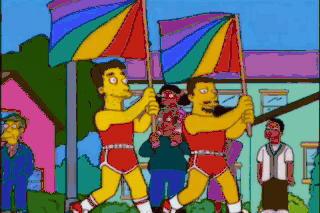 Rainbows. Tank tops. Empowerment. This is the gay pride parade! Whoo-hoo! We're here! We're queer! Get used to it! You do this every year. We are used to it. Spoilsport.