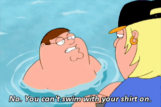 No. You can't swim with your shirt on. W-Wait a second. What are you hiding under your shirT? Do you have bruises? Did somebody hit you?