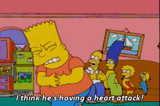 I think he's having a heart attack! (GROANS LOUDLY) (STAMMERING) Come on, son! You can fight this! Do the Bartman! Do the Bartman! (GRUNTING) Why don't you dance? Dance! (SOBBING)