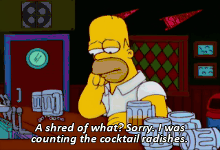 A shred of what? Sorry. I was counting the cocktail radishes. Now, where was I? Uh, two, three-- three radishes. Three big radishes.