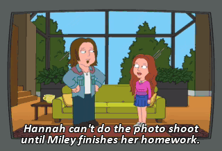 Hannah can't do the photo shoot until Miley finishes her homework.
