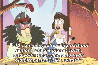 "Uh, Tammy, you're a high-School senior from the planet Earth, and you're marrying a 40-year-old Birdperson? Like, what?!"