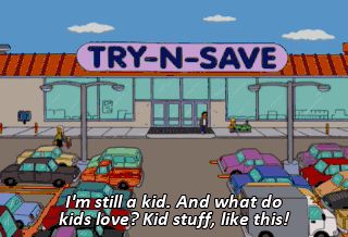 I'm still a kid. And what do kids love? Kid stuff, like this! (GRUNTING) Vroom-vroom, vroom, vroom, vroom, vroom. (MOANS) Whatcha realizing, jerk? That I'm not a kid anymore. That's harsh.
