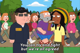 You can try and fight but we're all agreed Because everything is better with a bag o' weed