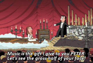 Music is the gift I give to you PETER: Let's see the gross half of your face! Come on! Let's see the gross half of your face so I can get out of here! That nose better be piggy.