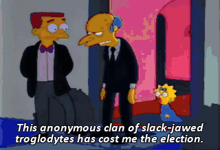 This anonymous clan of slack-jawed troglodytes has cost me the election. And yet, if I were to have them killed, I would be the one to go to jail.