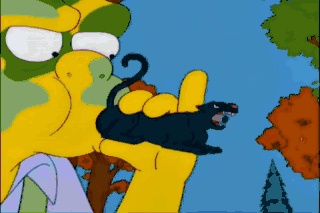 You did it, Moe! A cougar! Die, cougar! Ow! My leg! Oh, geez! Got that cat right in the leg. Dad, you shot Moe!