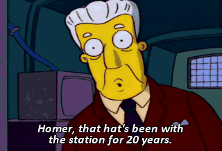 Homer, that hat's been with the station for 20 years. He had one day left till retirement. La la la la la Well, time to replenish the hot-dog roller. La la Oops! Oh, no. It is encrusted with filth.