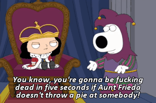 You know, you're gonna be fucking dead in five seconds if Aunt Frieda doesn't throw a pie at somebody! I mean, part of that is you sort of have to know my... - Make me laugh! - Hey, look. Keys.